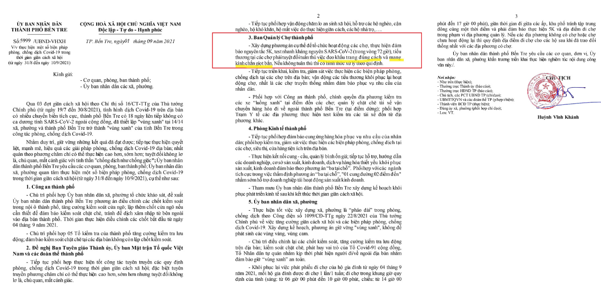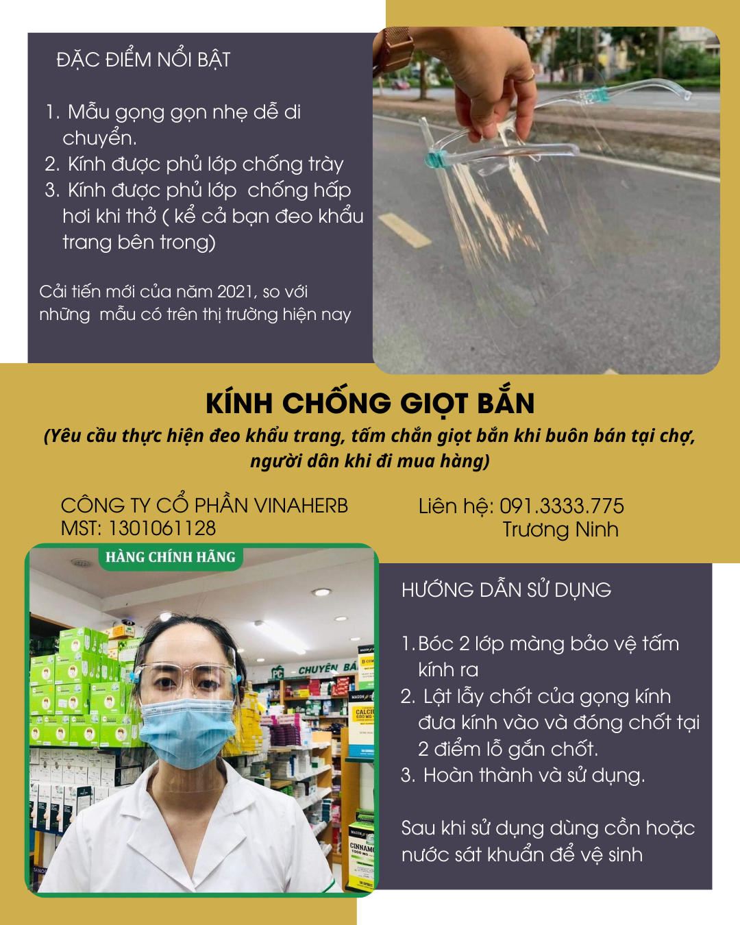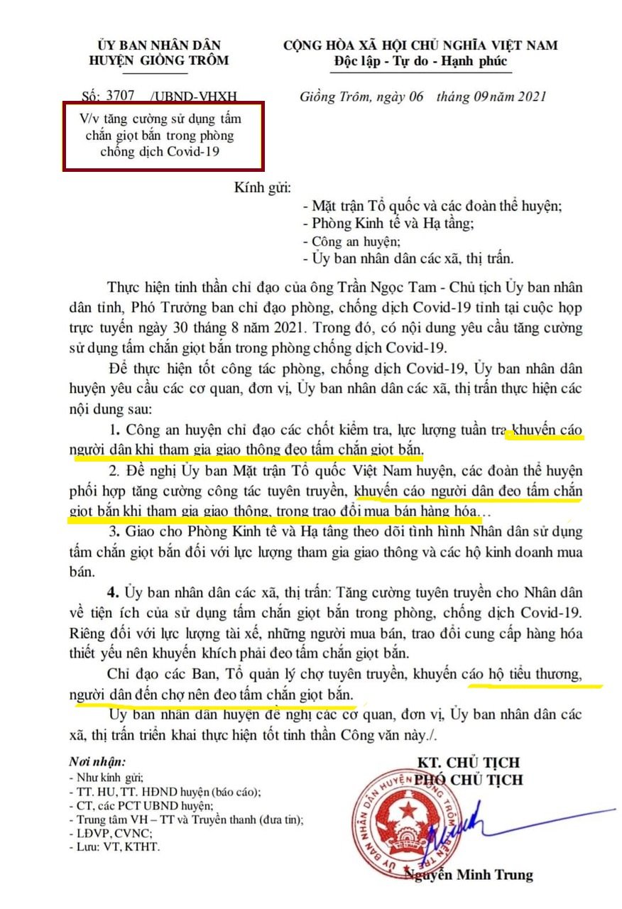 Theo hướng dẫn của Bộ Y Tế và phương án "Thực hiện các biện pháp phòng chống dịch COVID-19 trong tình hình mới" của Thành phố Bến Tre ngày 3/9/2021 mục 1.1 yêu cầu người dân đi mua hàng thiết yếu phải đảm bảo mang tấm chắn giọt bắn, đeo khẩu trang và giãn cách và người bán hàng phải mang khẩu trang, tấm chắn giọt bắn, có trang bị đầy đủ nước rửa tay, thực hiện giãn cách và một số quy đinh khác. Còn có văn bản sô 5999 "V/v thực hiện một số biện pháp phòng chống dịch COVID-19 trong thời gian giãn cách xã hội" của TP Bến Tre. Tương tự huyện Giồng Trôm ra văn bản 3707 " V/v tăng cường sử dụng tấm chắn giọt bắn trong phòng chống dịch Covid-19" ngày 06/9/2021. Công Ty Cổ Phần Vinaherb quyết định cung cấp sản phẩm “kính chống giọt bắn bảo hộ dành cho người lớn” cho doanh nghiệp, hộ kinh doanh, hợp tác xã, người dân vượt qua đại dịch với mức trợ giá phù hợp. (Dự đoán sẽ khan hiếm hàng trong thời gian tới!)